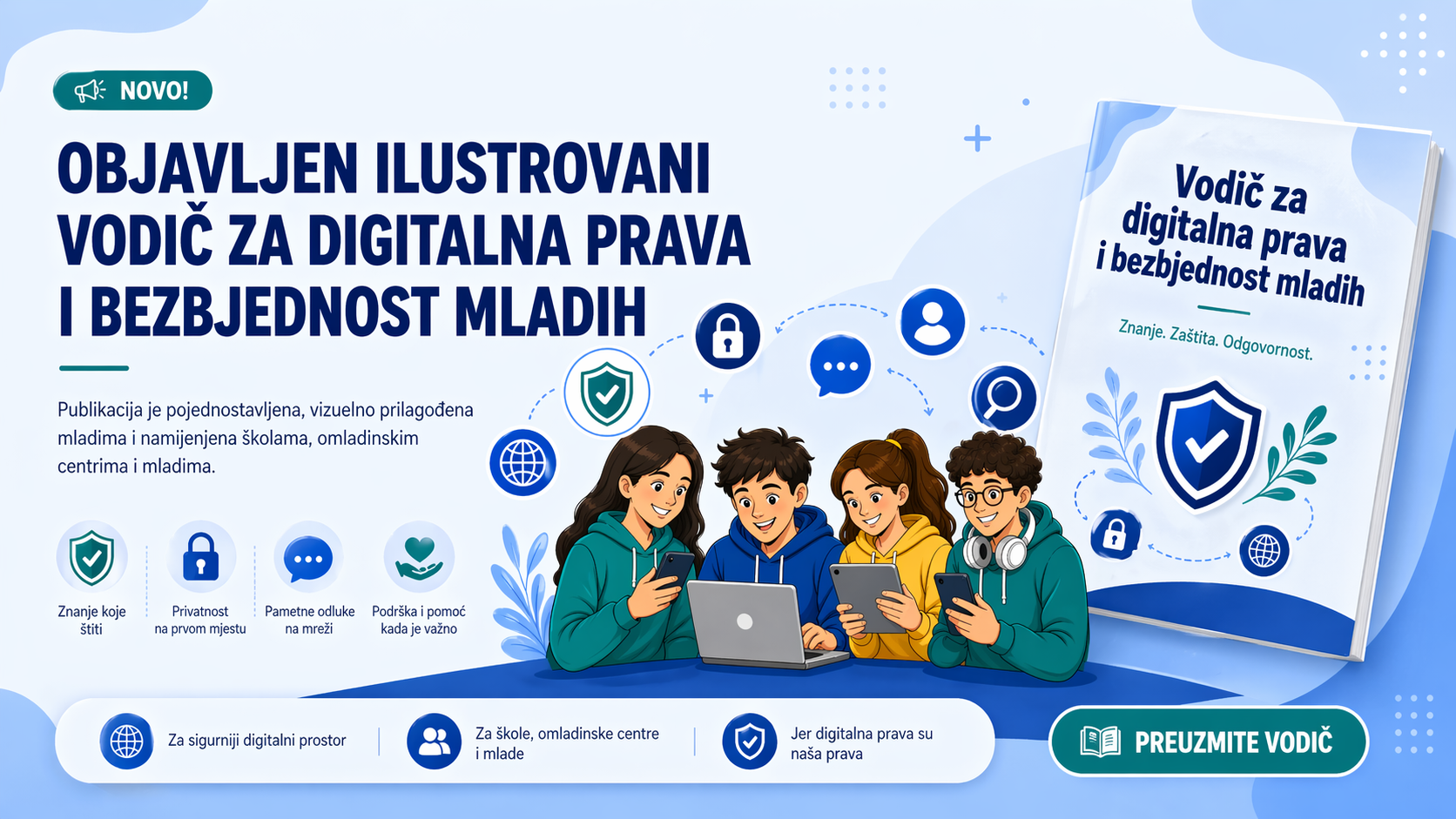 Vodič je osmišljen kao praktičan materijal za mlade, škole, omladinske centre, nastavnike, roditelje i sve koji rade sa mladima. Kroz kratak i pristupačan tekst, jasne poruke, praktične savjete i ilustracije, publikacija mladima približava teme koje su danas neophodne za sigurno i odgovorno korišćenje interneta.