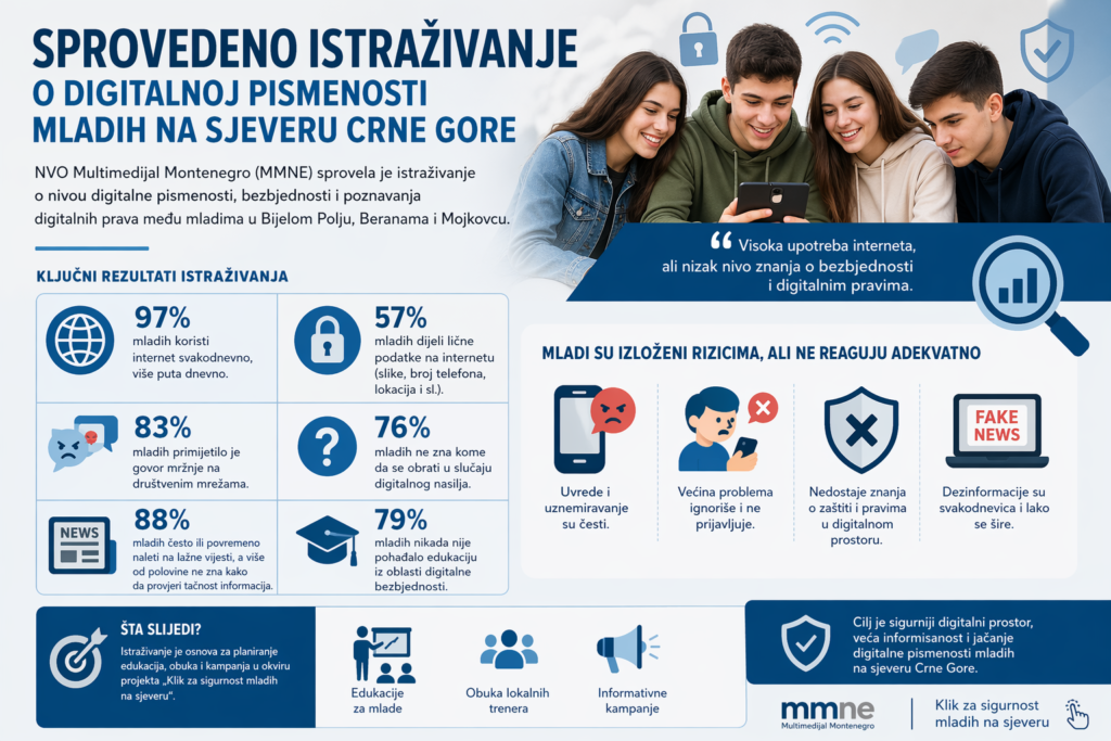 NVO Multimedijal Montenegro (MMNE) sprovela je istraživanje o nivou digitalne pismenosti, bezbjednosti i poznavanja digitalnih prava među mladima na sjeveru Crne Gore, koje je obuhvatilo učenike i mlade iz Bijelog Polja, Berana i Mojkovca.